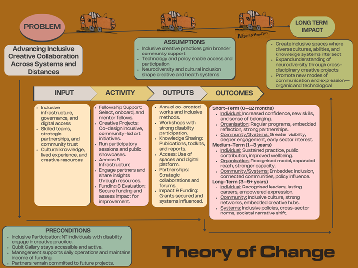 The Theory of Change underpinning the Qubit Incubator is based on the belief that micro-level interactions in collaborative artmaking can influence and reshape broader systems. Through reflective practice and deep listening, the fellowship program acts as a catalyst for inclusive and transformative creative work in the Northern Territory, contributing meaningfully to both the arts and wider community sectors.